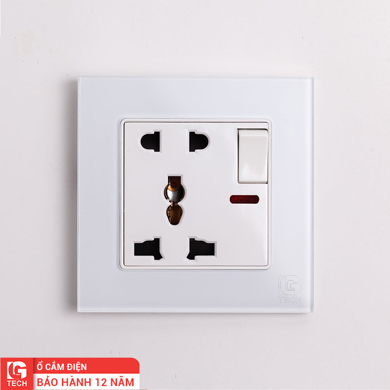 Ổ cắm điện 5 chấu, có công tắc an toàn và đèn báo, chuẩn vuông, viền kính màu trắng LG Tech mã LG-F71W-021